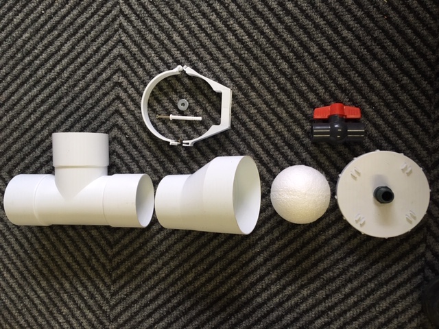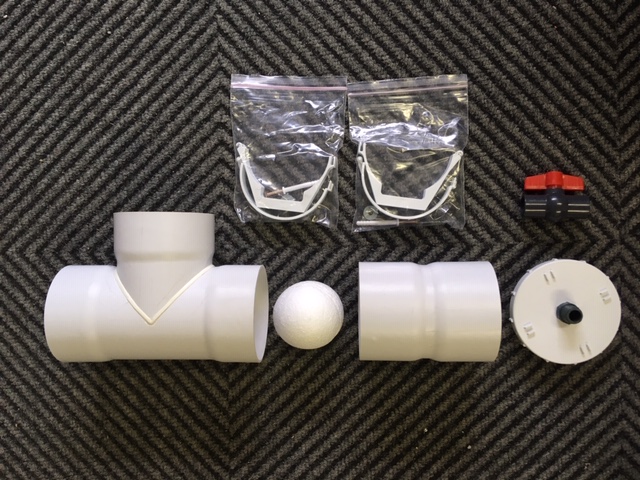 • 1) First Flush DIY Kit: R295 each. (Discount available for bulk orders). Kit Includes: Top intake cap/adaptor (Intake to fit to standard 80mm round downpipes), float ball, mounting brackets, 80mm T piece, bottom base cap with screw off cap for cleaning, valve for draining the system. Supplied in box with diagram. Kit does not include the 110mm chamber pipe. (Full description of First flush system, how they work, and instruction sheet available to email on request).